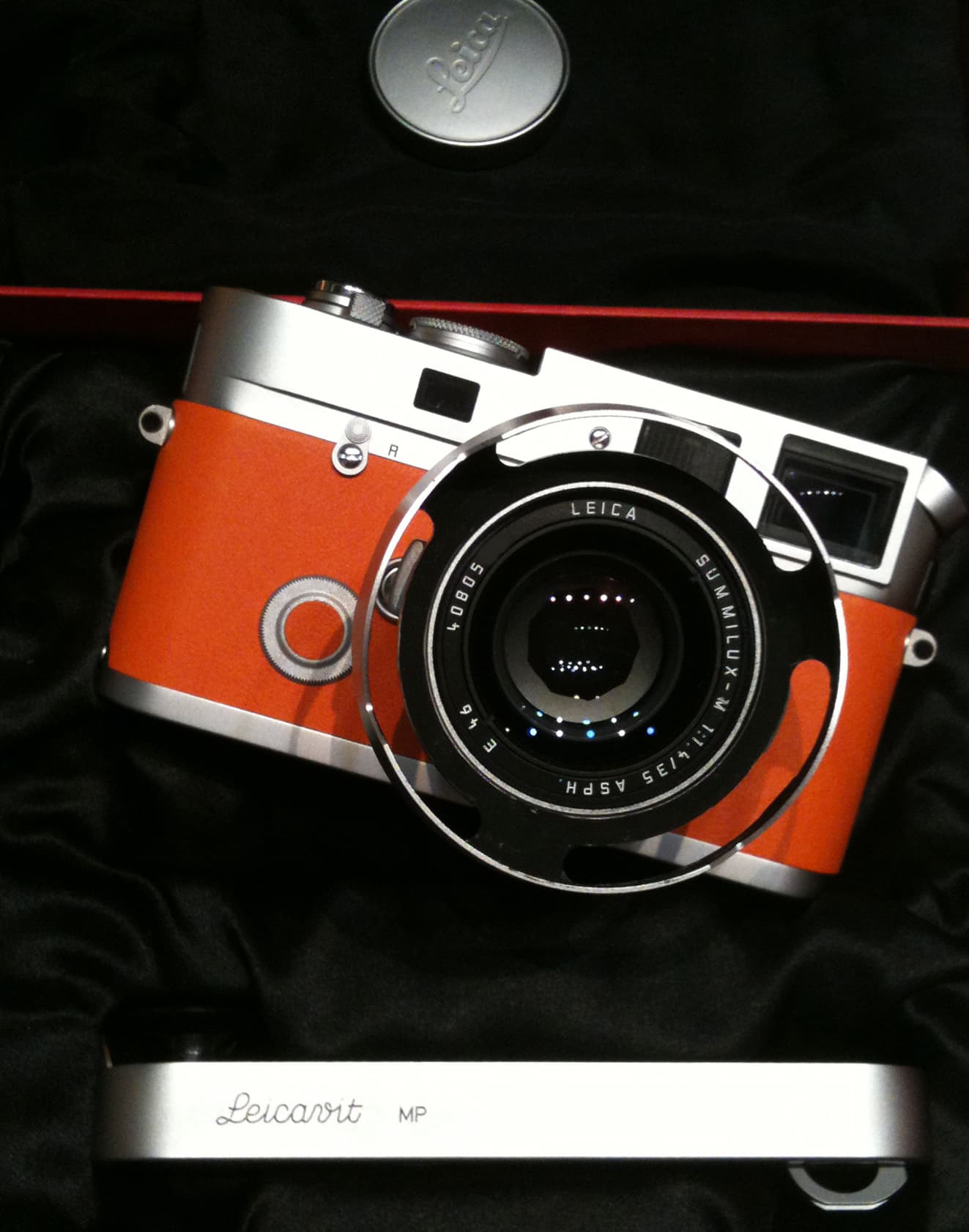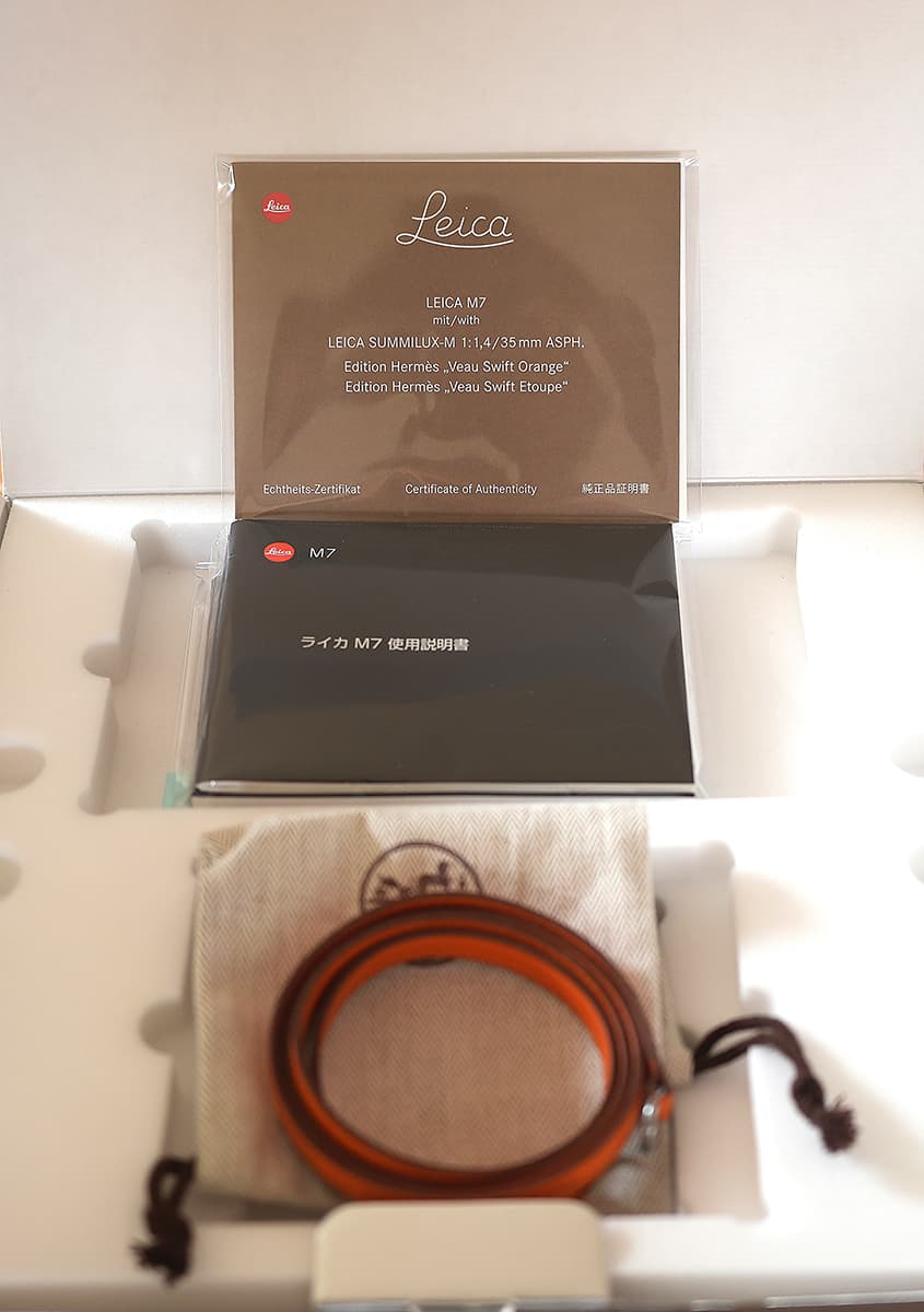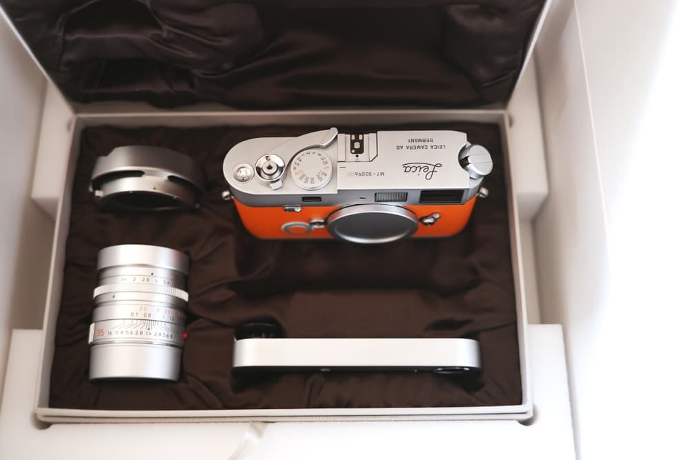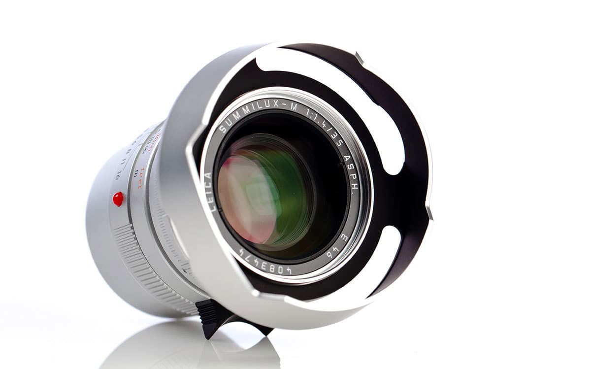 シルバーアルマイト仕上げの「ライカ ズミルックスM f1.4/35mm ASPH.」広角レンズを標準装備。またレンズにはエルメスエディション専用のクラシックな丸型のシルバーアルマイト仕上げ金属製レンズフードを付属している。